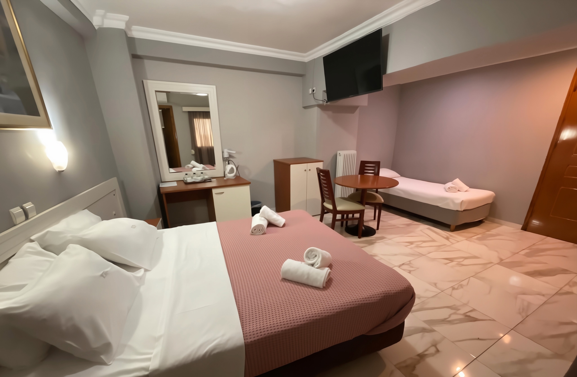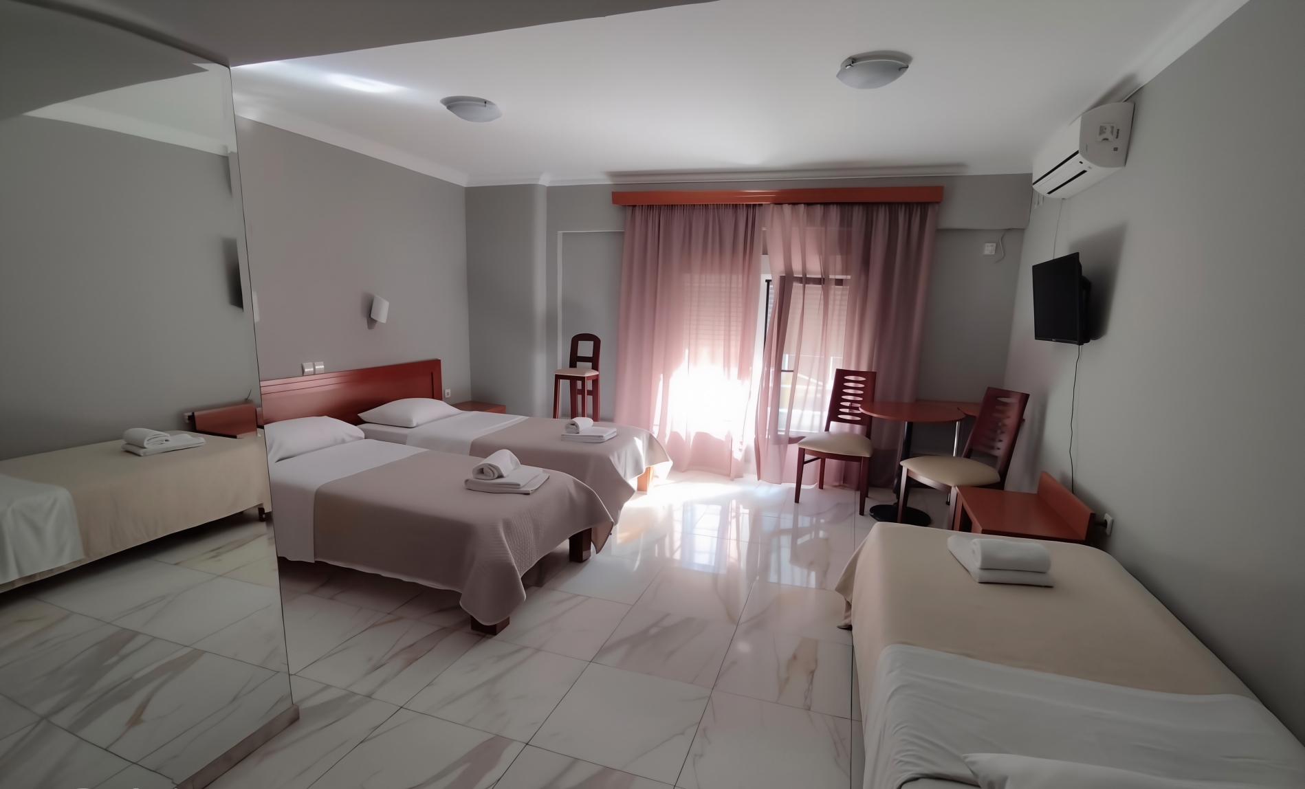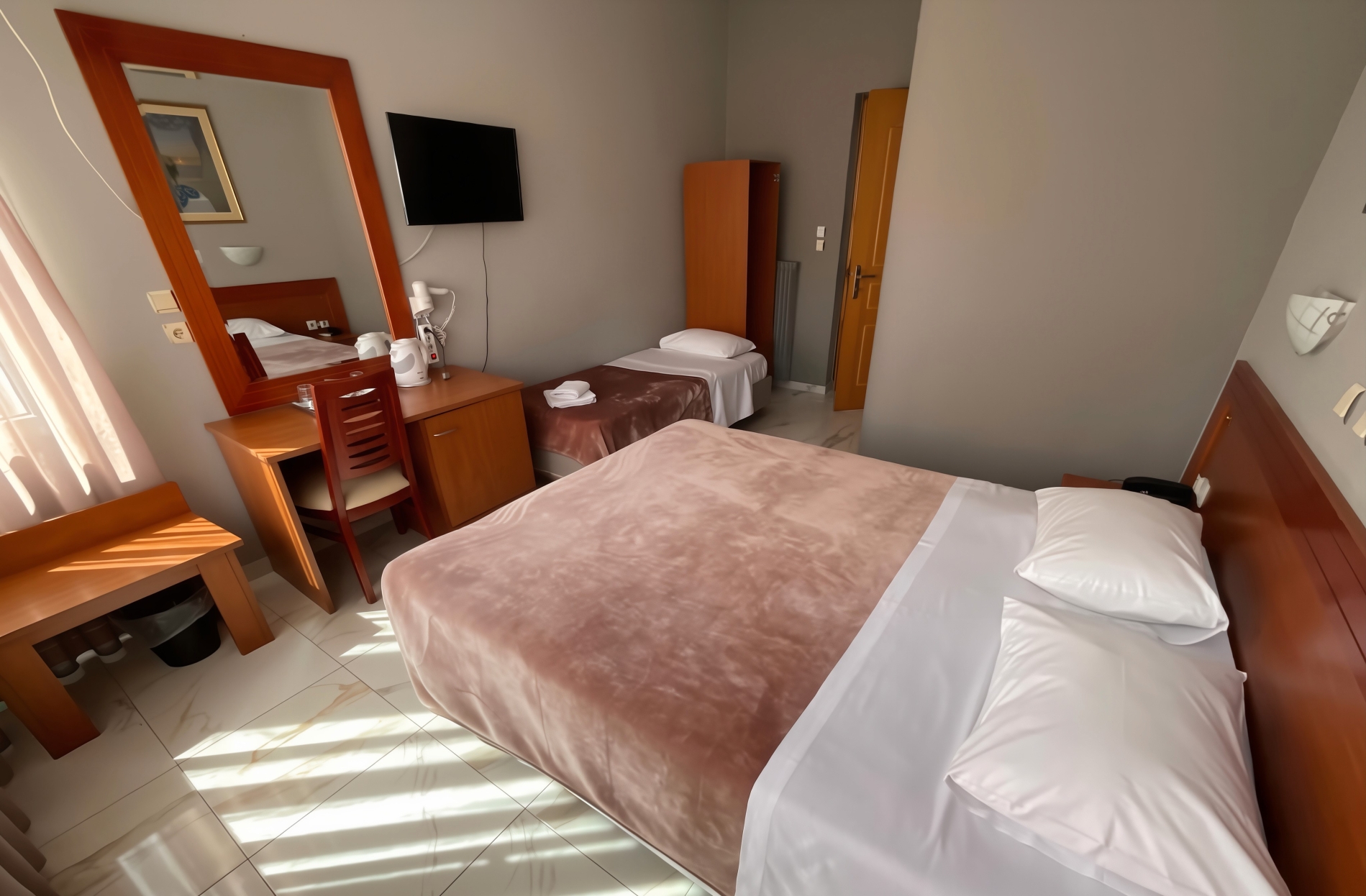 Modernes Zimmer mit Fliesenböden, Flachbild-TV, Minikühlschrank und Holzmöbeln. Kostenloses WLAN ist verfügbar.