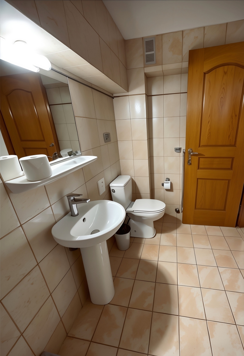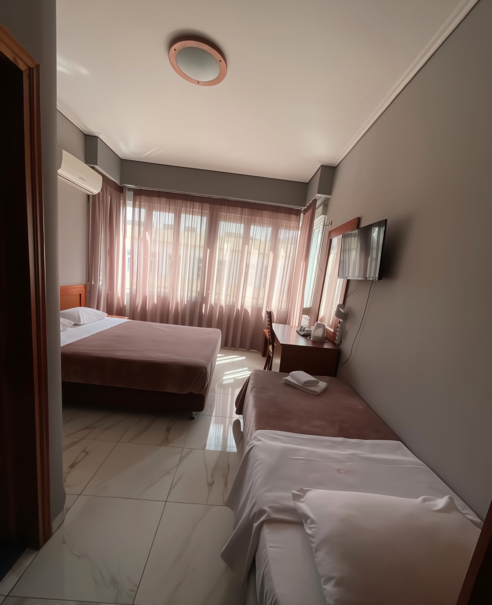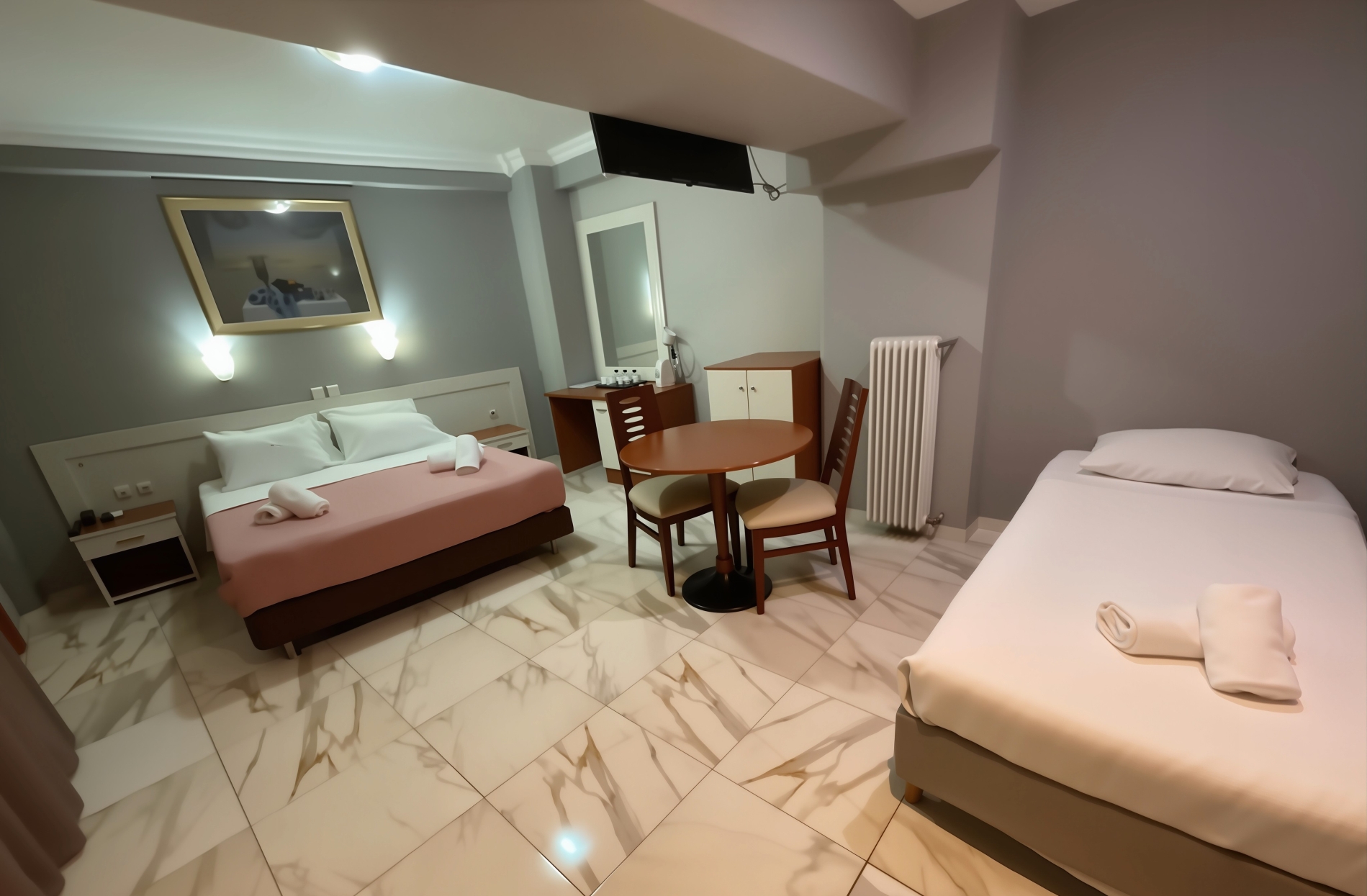 Modernes Zimmer mit Fliesenböden, Flachbild-TV, Minikühlschrank und Holzmöbeln. Kostenloses WLAN ist verfügbar.