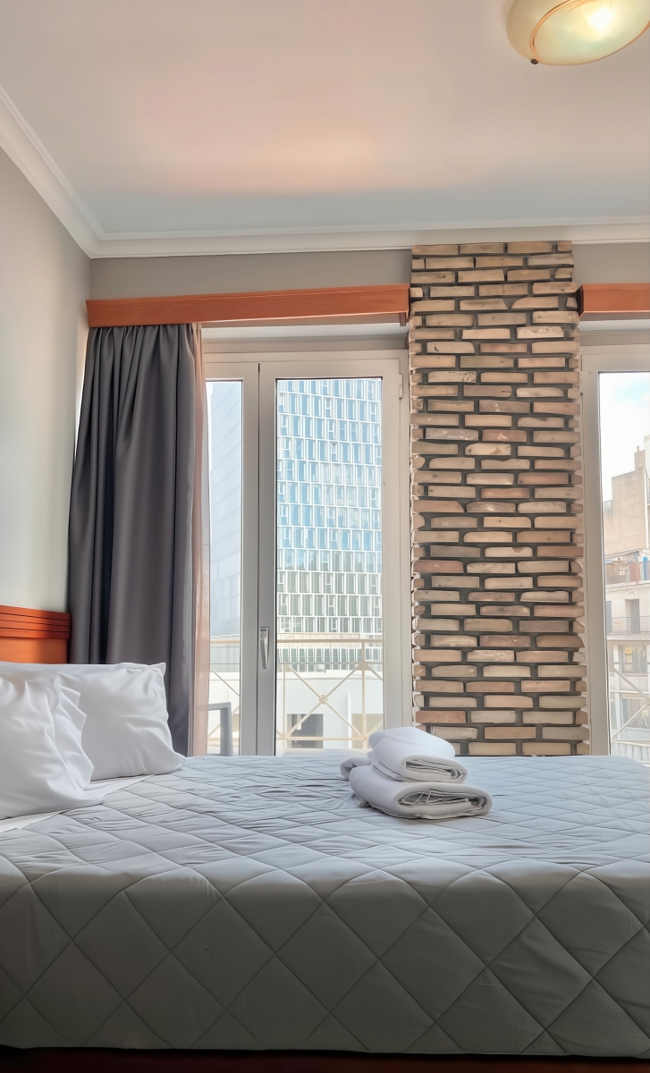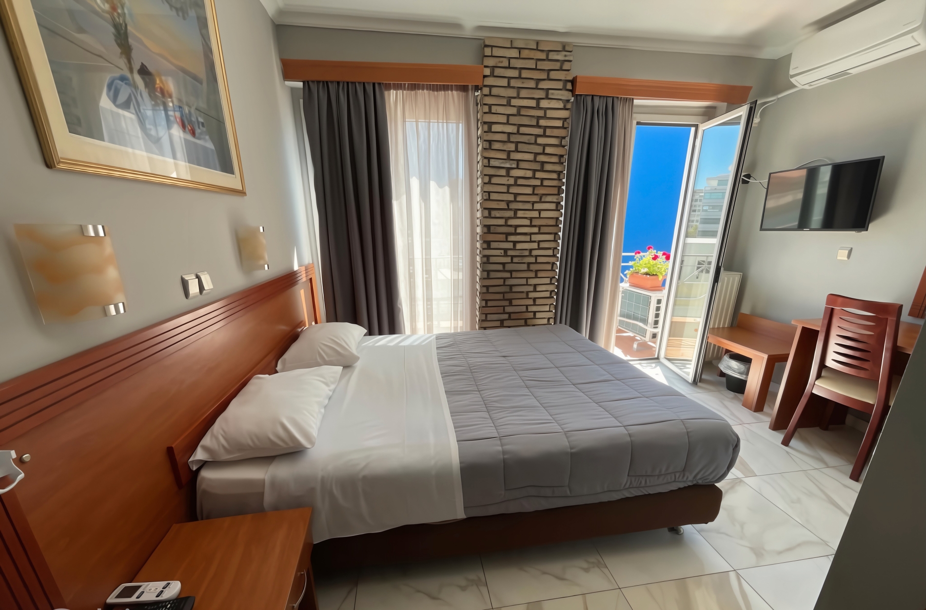 Habitación moderna con suelos de baldosas, TV de pantalla plana, mininevera y muebles de madera. Hay conexión WiFi gratuita. Tenga en cuenta que no todas las unidades dan a un balcón (sujeto a disponibilidad).